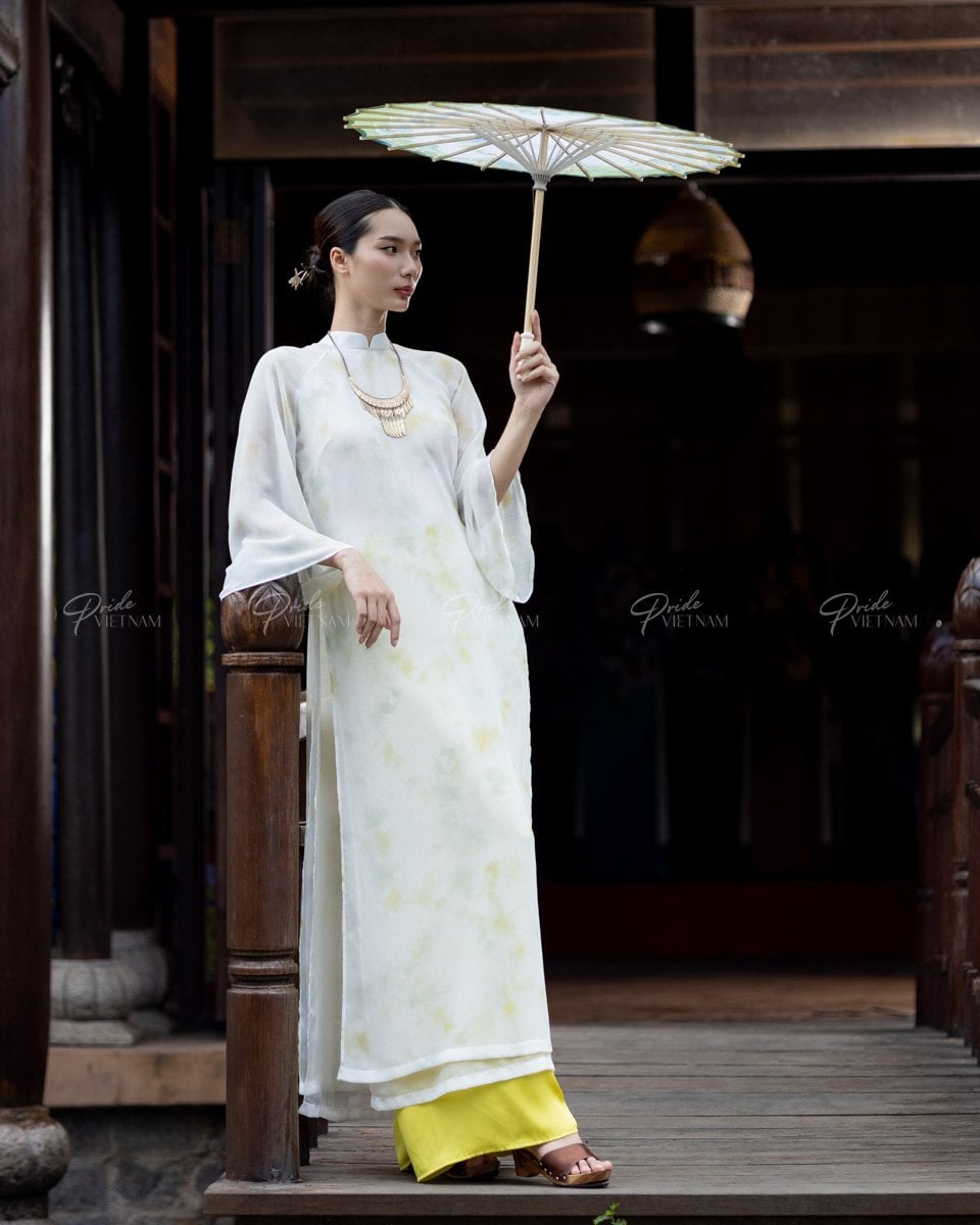 Điểm nhấn của thiết kế là gam màu trắng ngà thanh thoát, được tô điểm bởi những họa tiết như những hoa văn chìm, màu vàng nhạt trải đều khắp thân áo, tạo cảm giác như những cánh hoa rơi hoặc ánh nắng nhẹ nhàng. Họa tiết này tạo nên chiều sâu và sự cuốn hút một cách ý nhị.