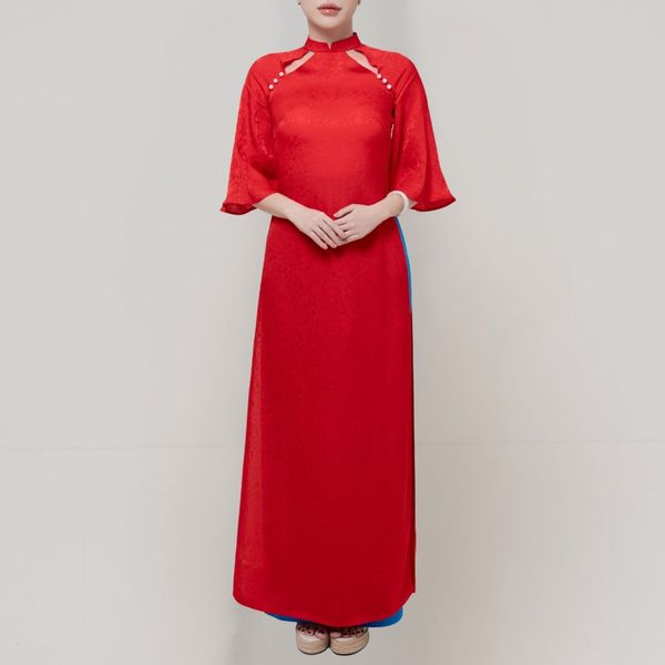 Áo Dài May Sẵn Nữ Tay Loe Chất Liệu Gấm Màu Đỏ Tươi Sang Trọng 1W20B341