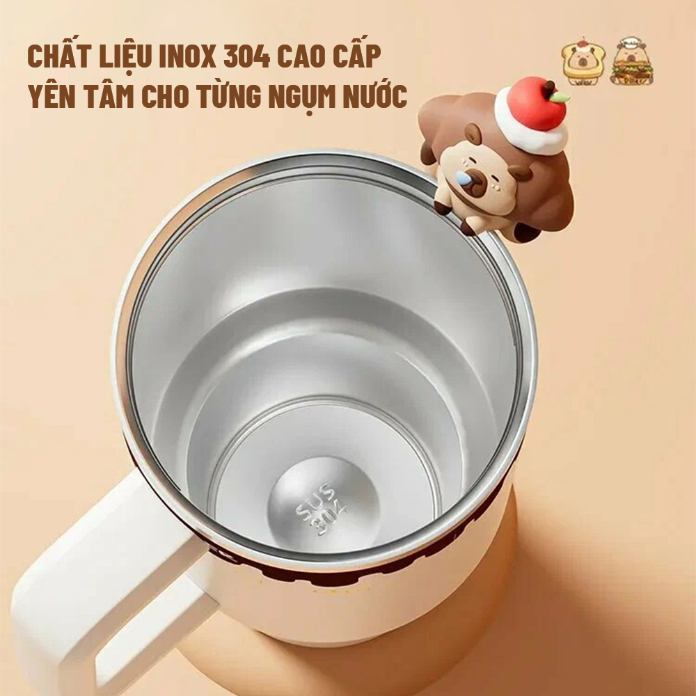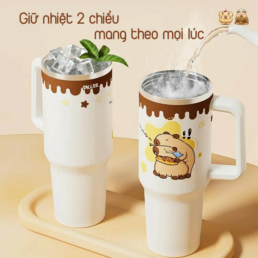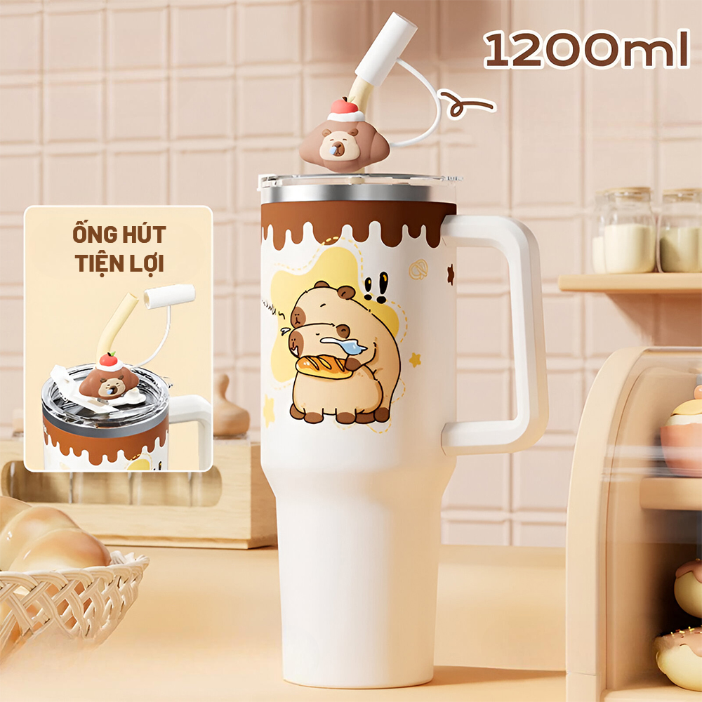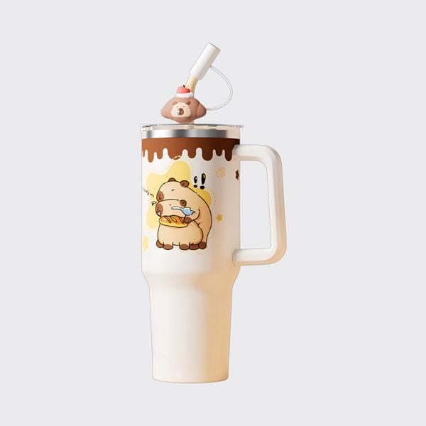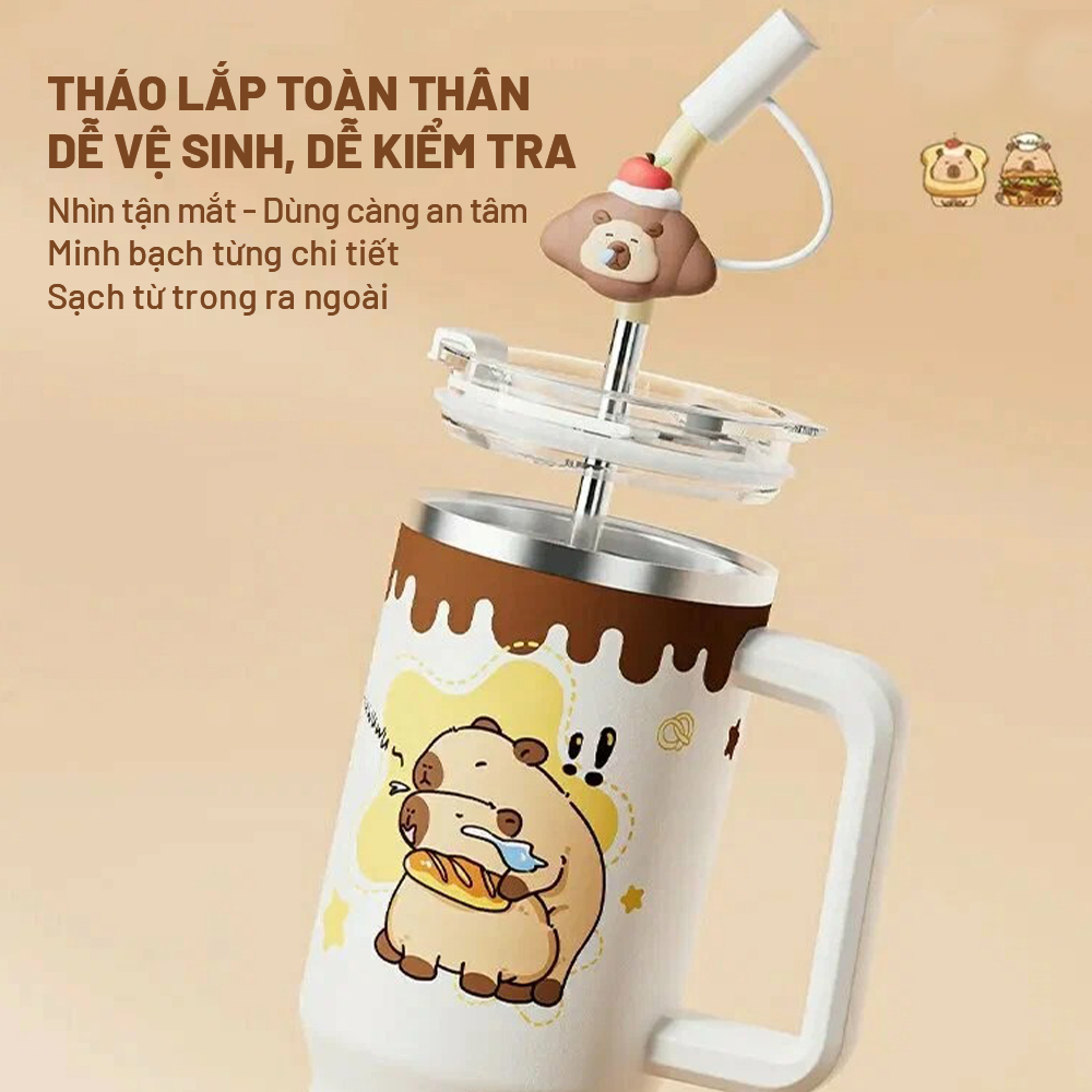 Trang bị ống hút inox bền bỉ, đi kèm nắp đậy hình Capybara dễ thương.