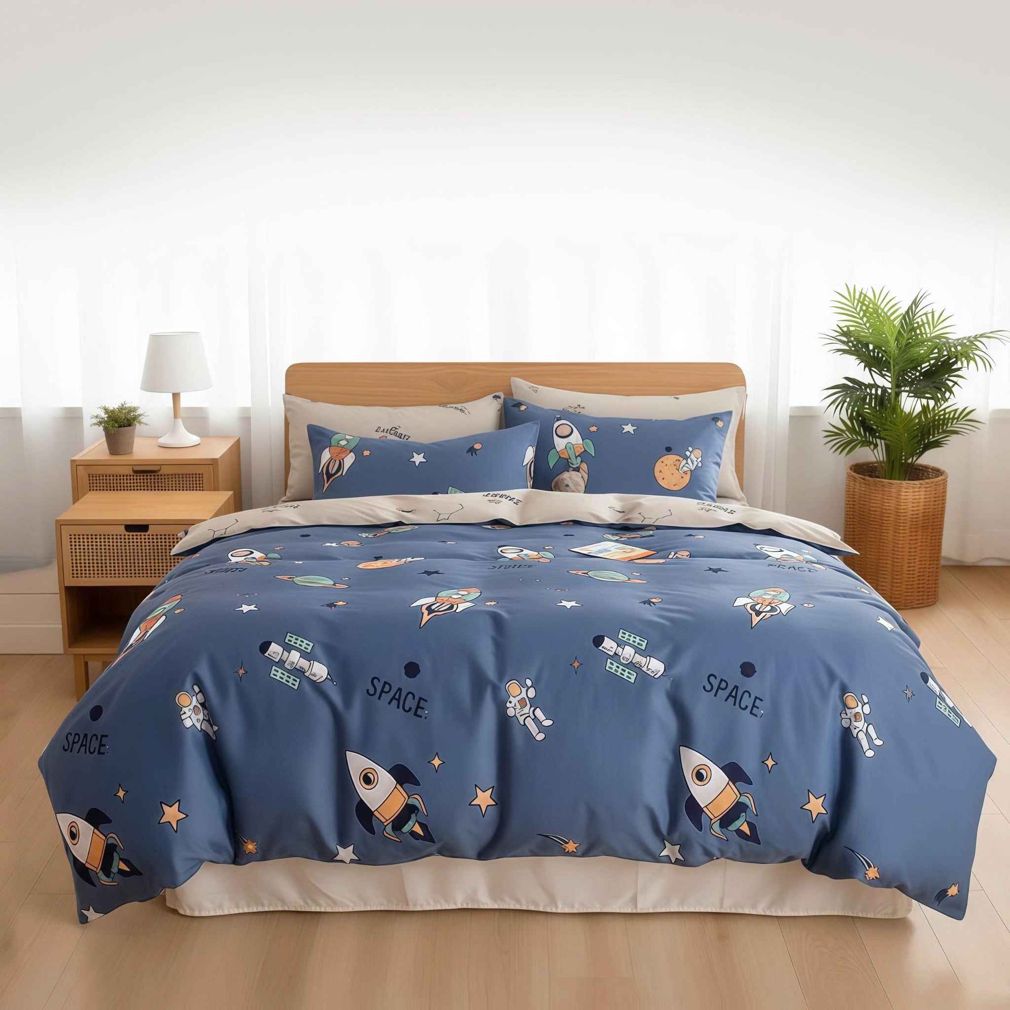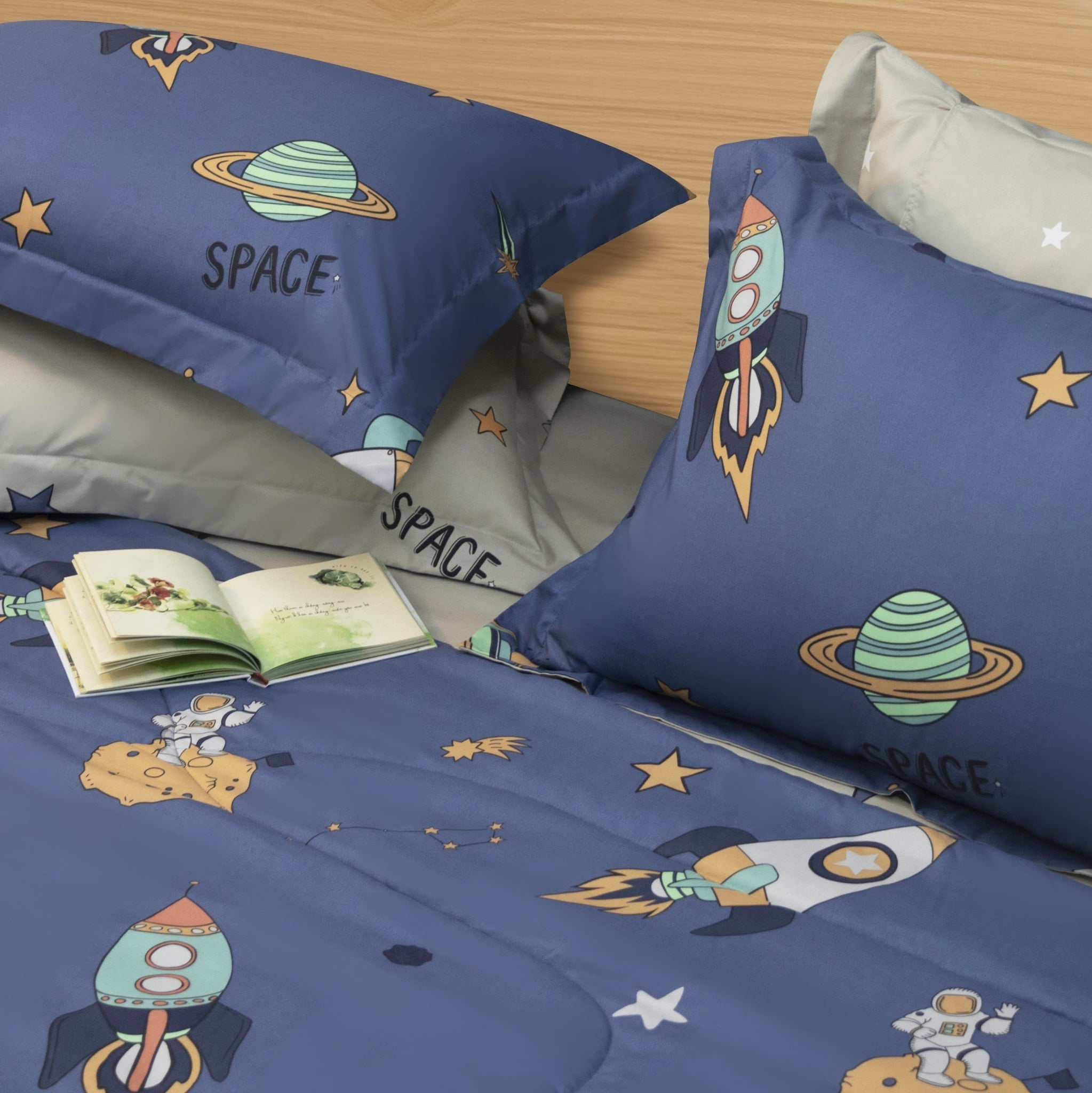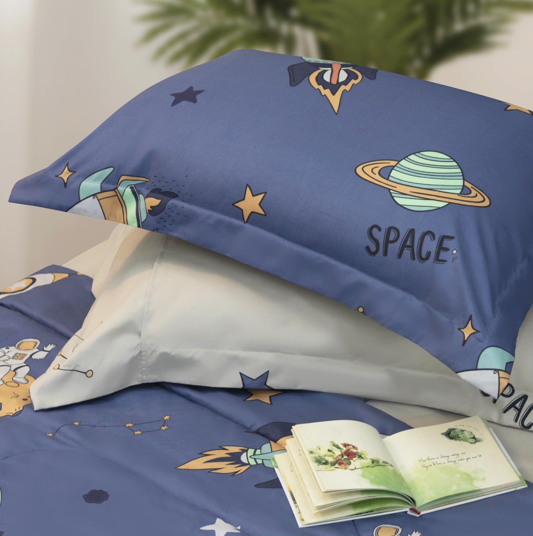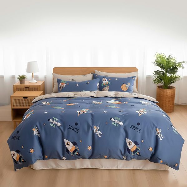 Bộ chăn ga gối CT220041 lấy cảm hứng từ vũ trụ và hành trình khám phá không gian, với họa tiết phi hành gia, tàu vũ trụ, hành tinh, sao băng và chữ “SPACE” được in sắc nét.