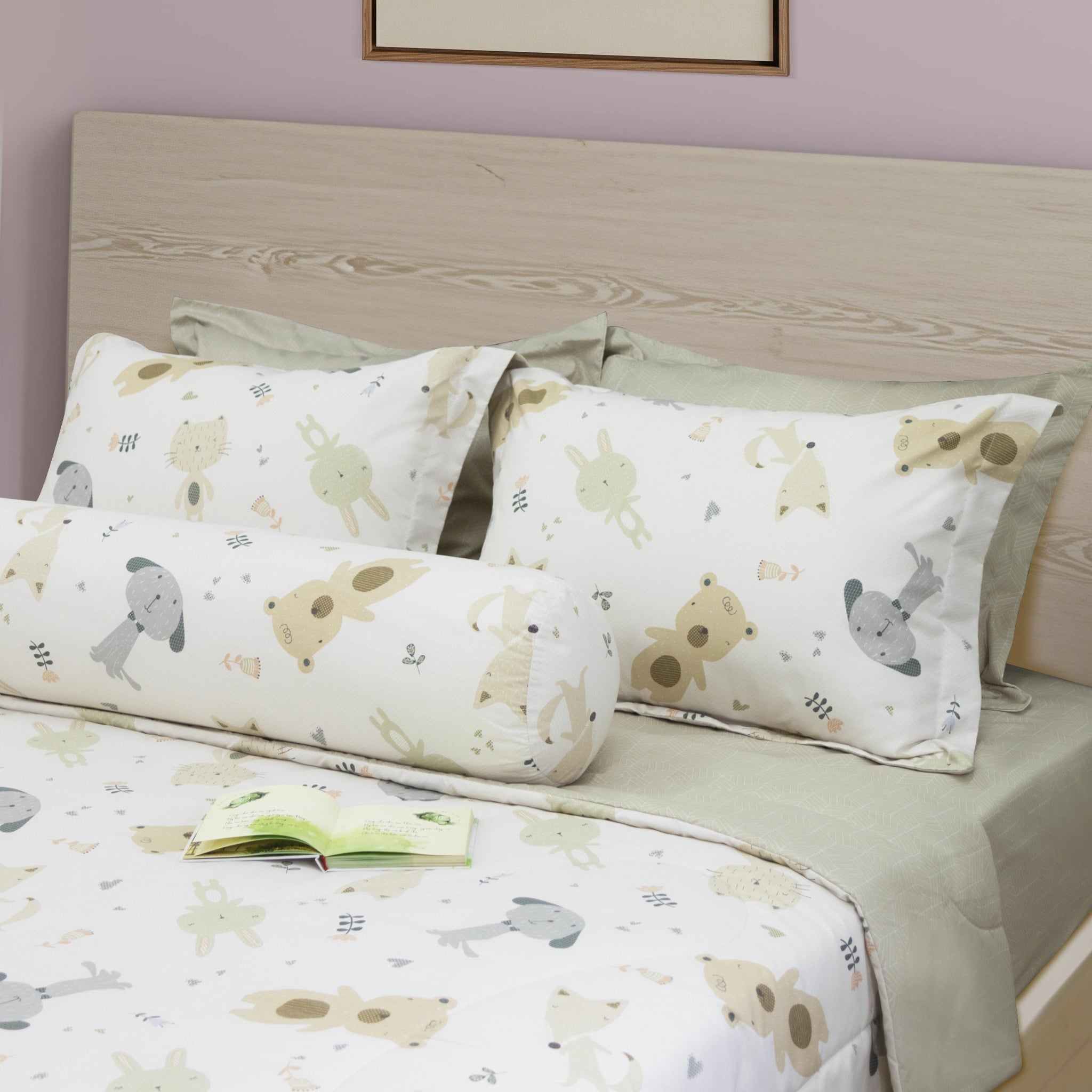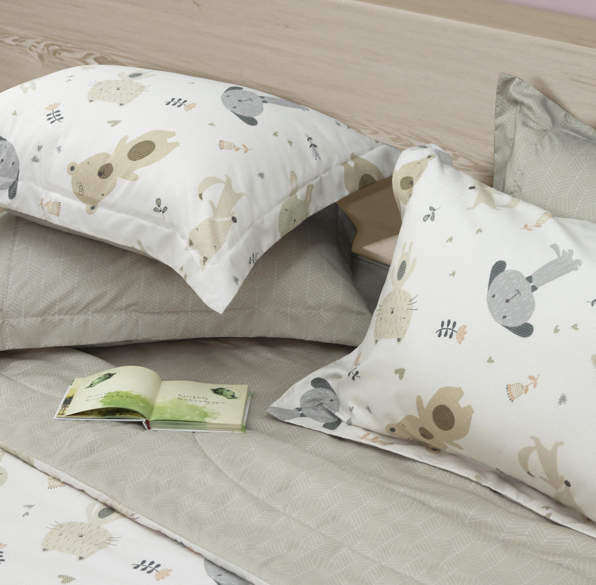 Các nhân vật động vật như gấu, thỏ, mèo, chó được thể hiện sinh động và thân thiện, giúp bé cảm thấy vui thích mỗi khi đi ngủ.