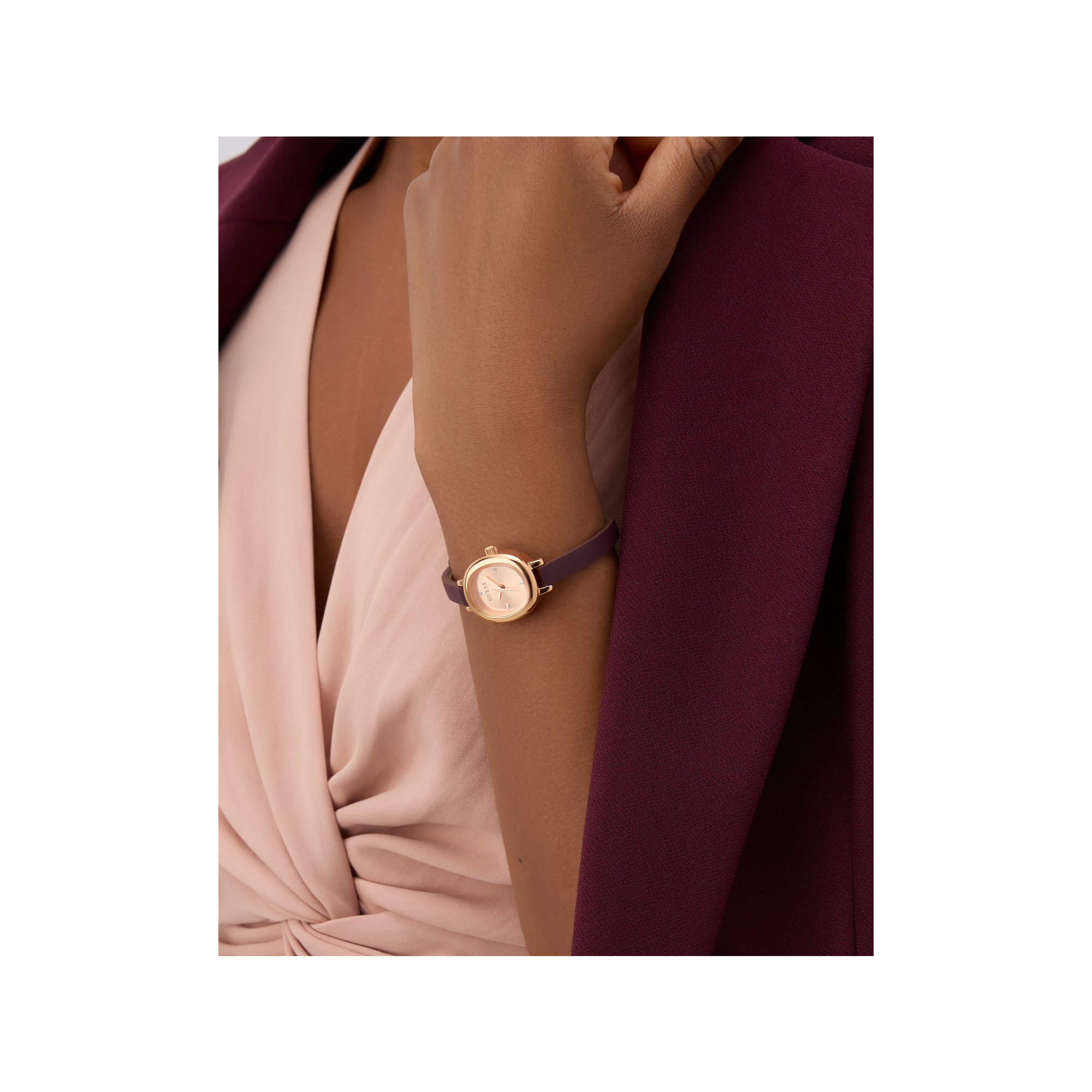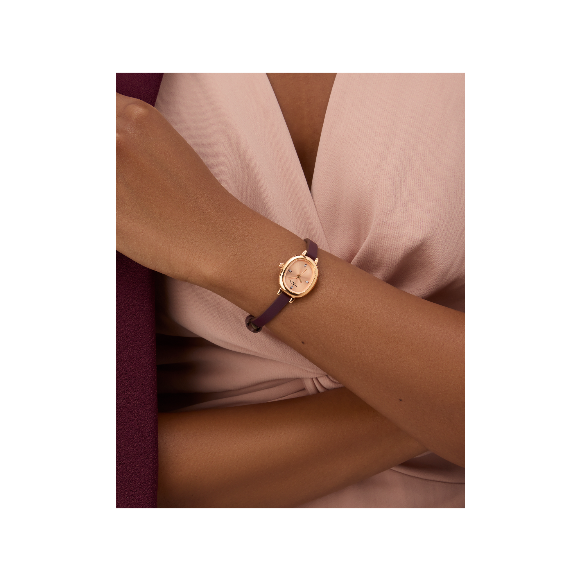 • Dây đeo: Dây đeo bằng da màu đỏ đô.