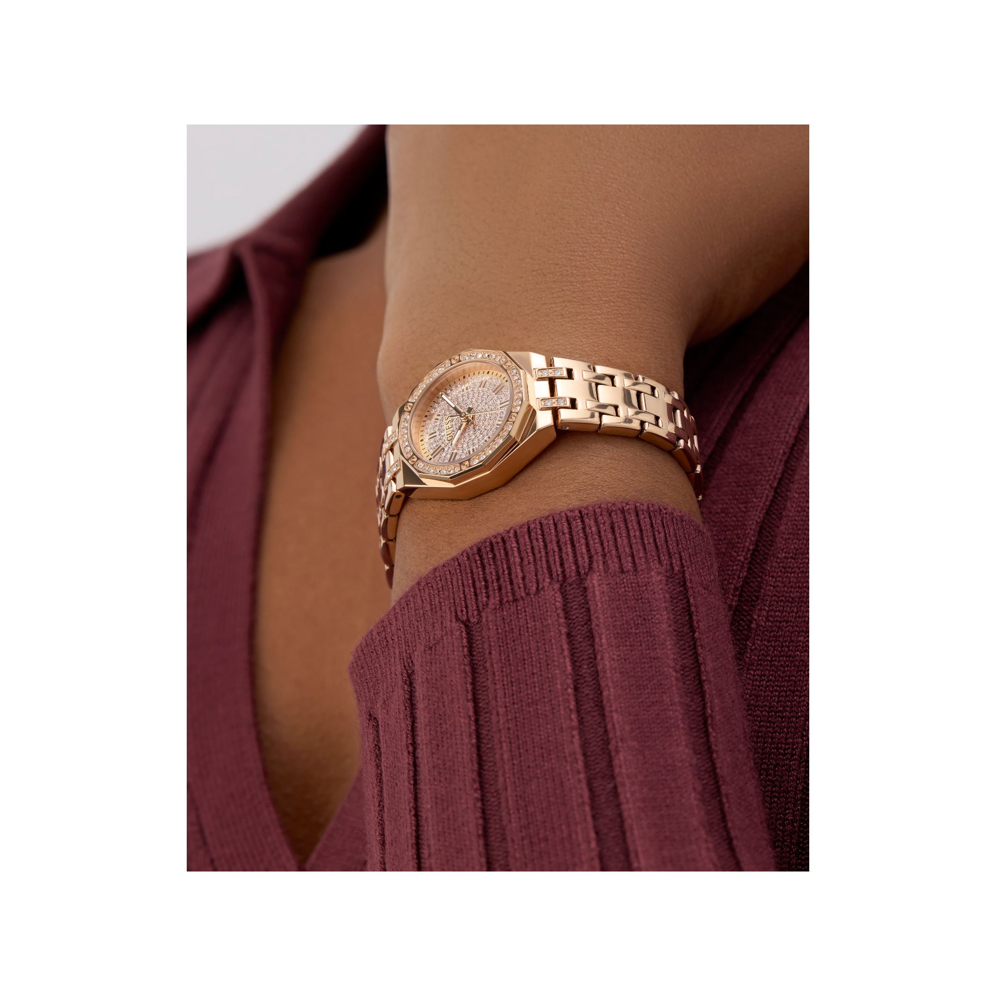 • Viền đồng hồ: Vàng hồng có đá quý.
