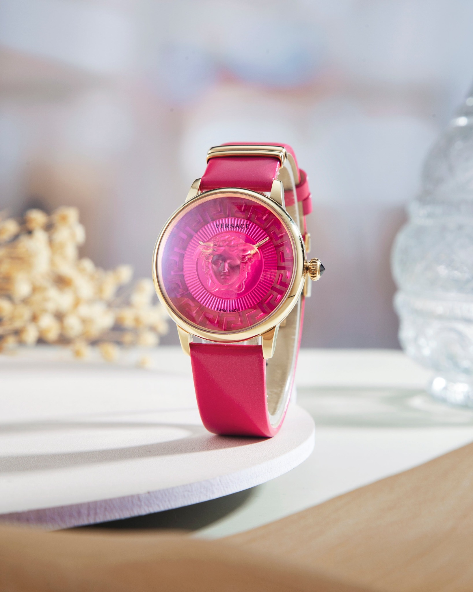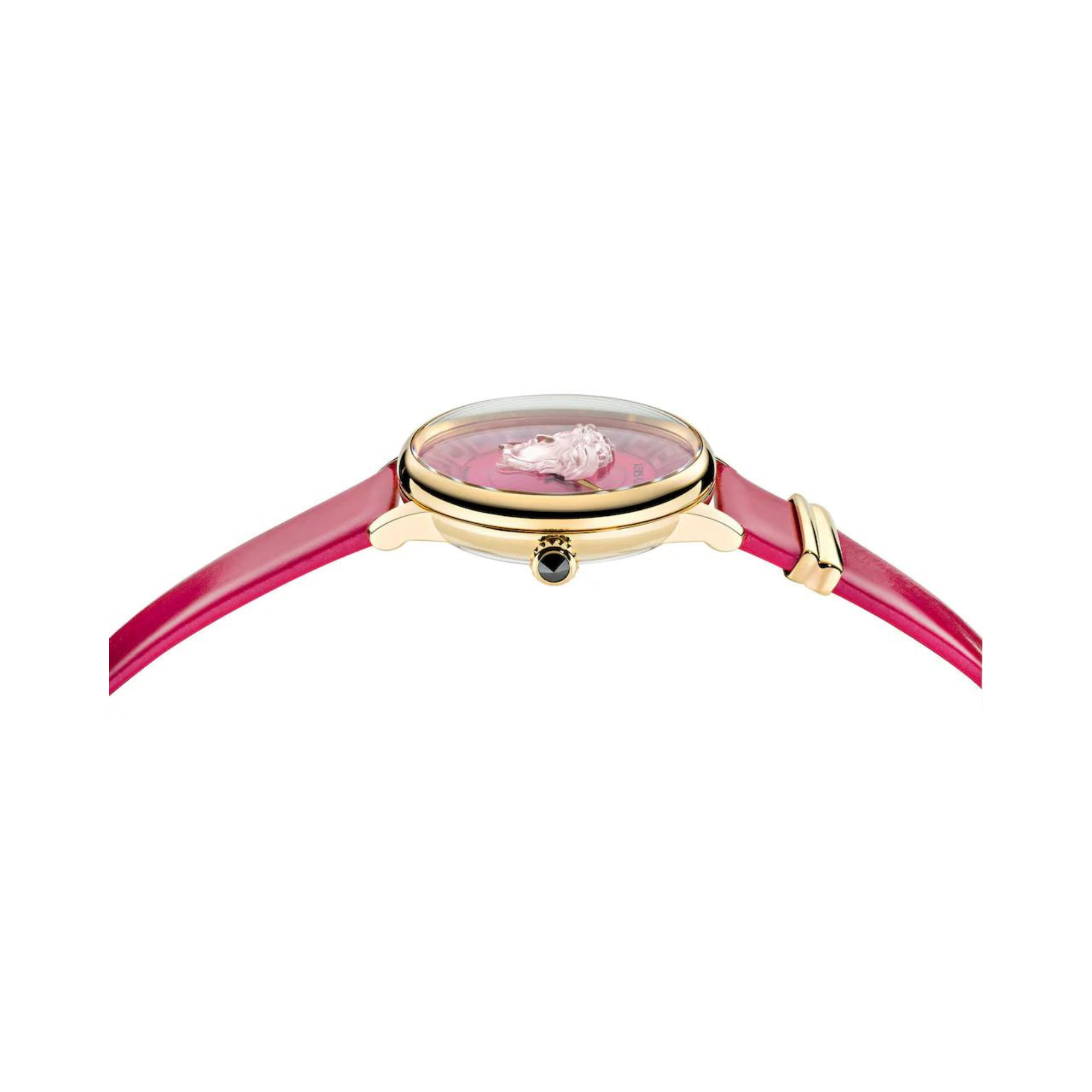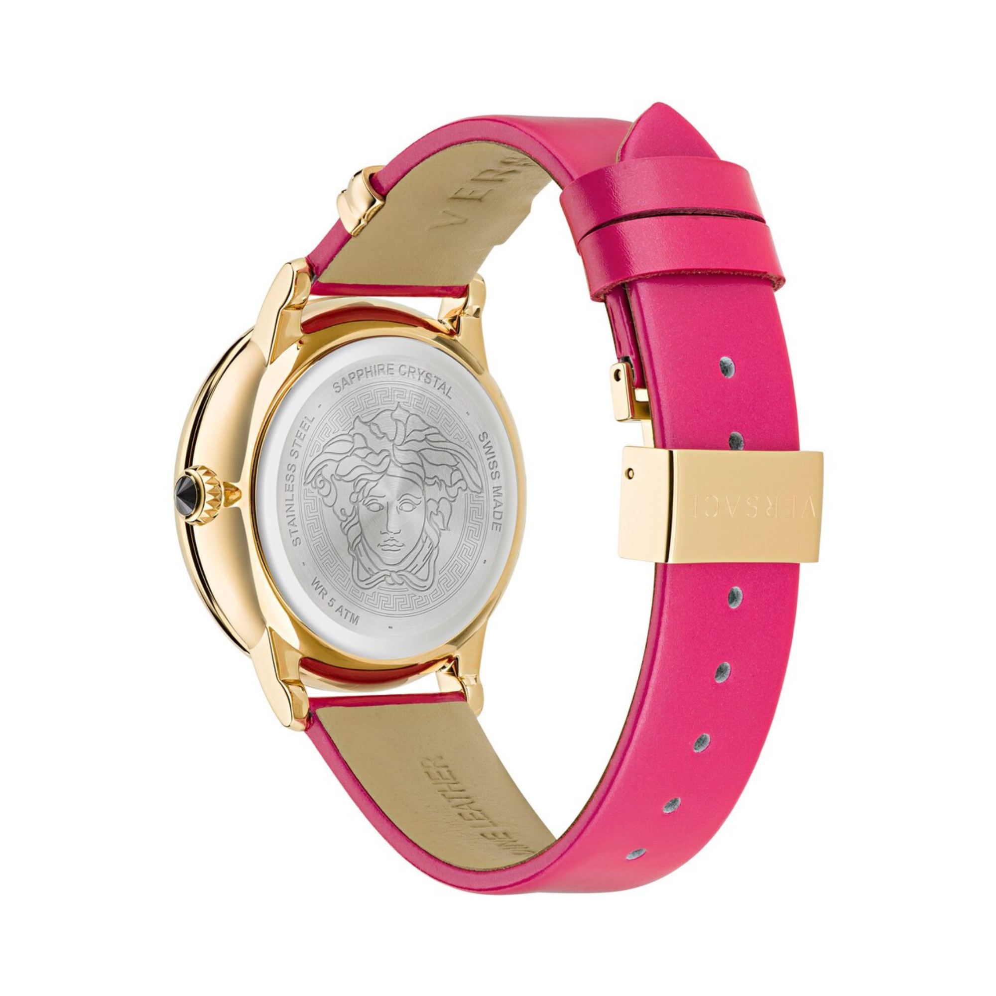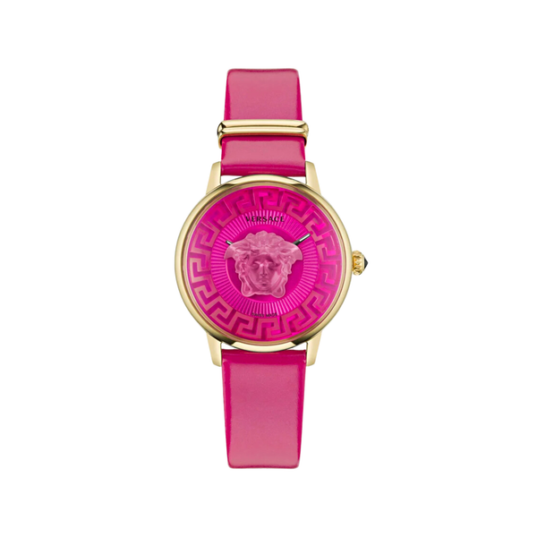 - Mặt số: tròn, viền bằng kim loại mạ vàng, mặt số màu hồng hoa vân anh với biểu tượng đầu Medusa 3D và hoạt tiết Greca bên trong, logo Versace tại vị trí 12h.