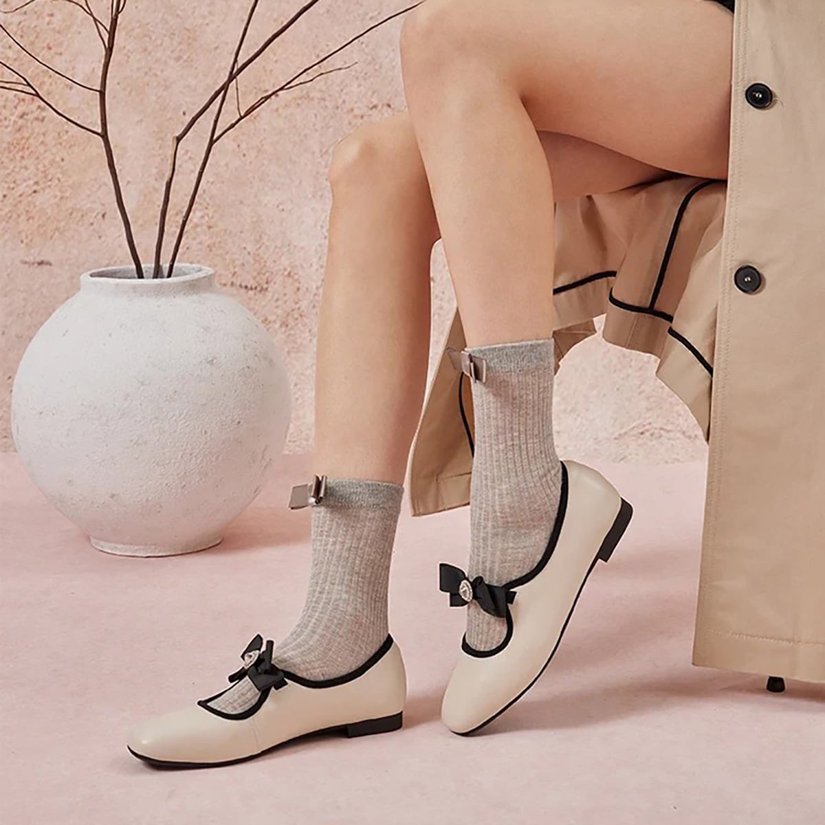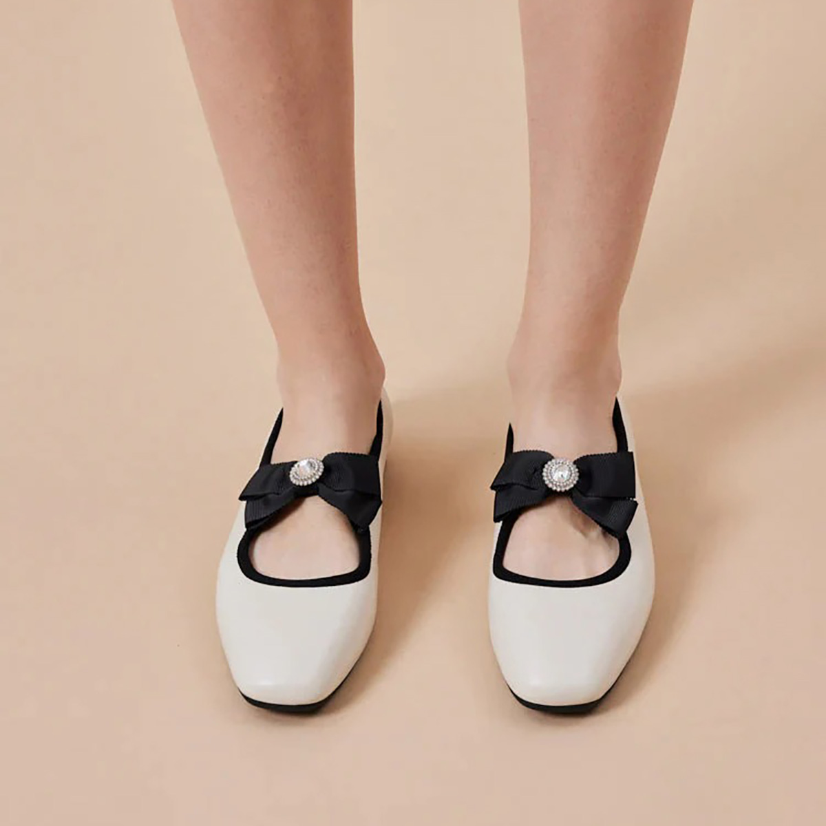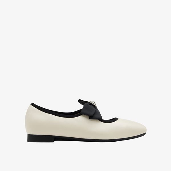 Camilla tái định nghĩa phong cách kinh điển của đôi flats Mary Jane với nét hiện đại đầy ấn tượng. Được chế tác từ da cừu mềm mịn màu beige kết hợp với da bóng patent màu đen, đôi flats này nổi bật với chi tiết nơ tinh tế, điểm nhấn là trung tâm đính đá lấp lánh. Đế trong thông thoáng, hỗ trợ vòng cung chân cùng phần gót mềm êm ái, mang đến sự cân bằng hoàn hảo giữa phong cách thời thượng và cảm giác thoải mái suốt cả ngày.