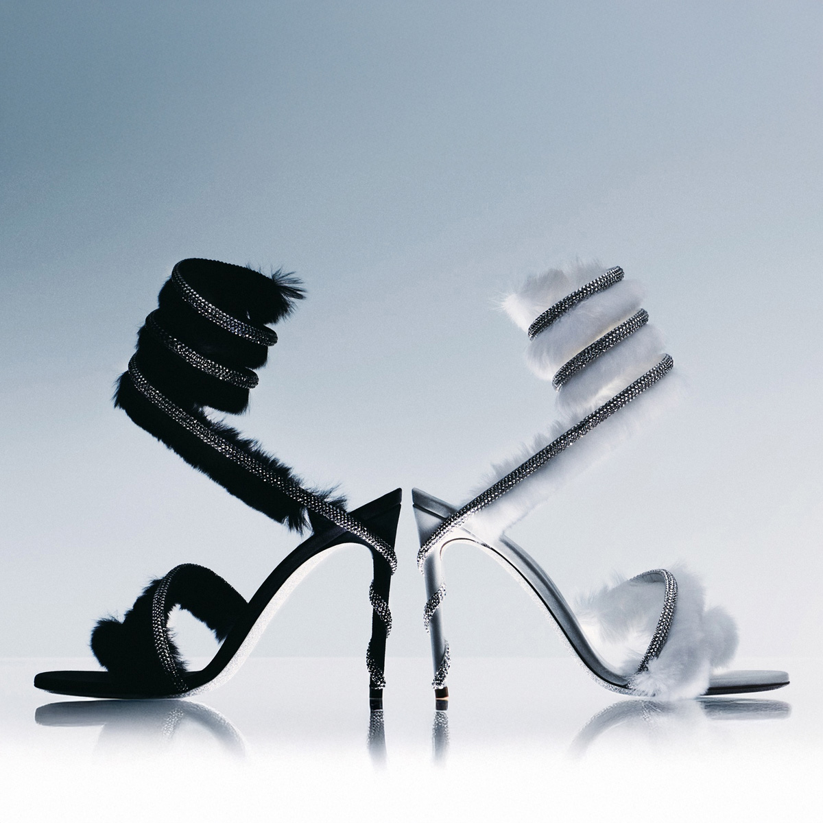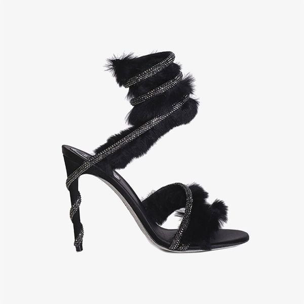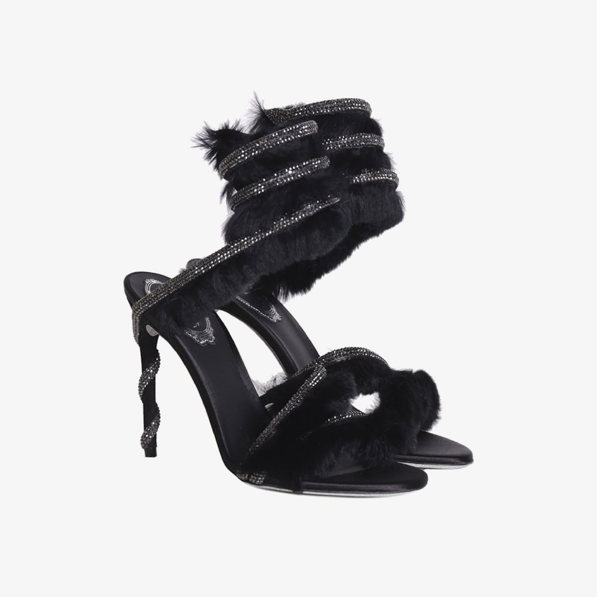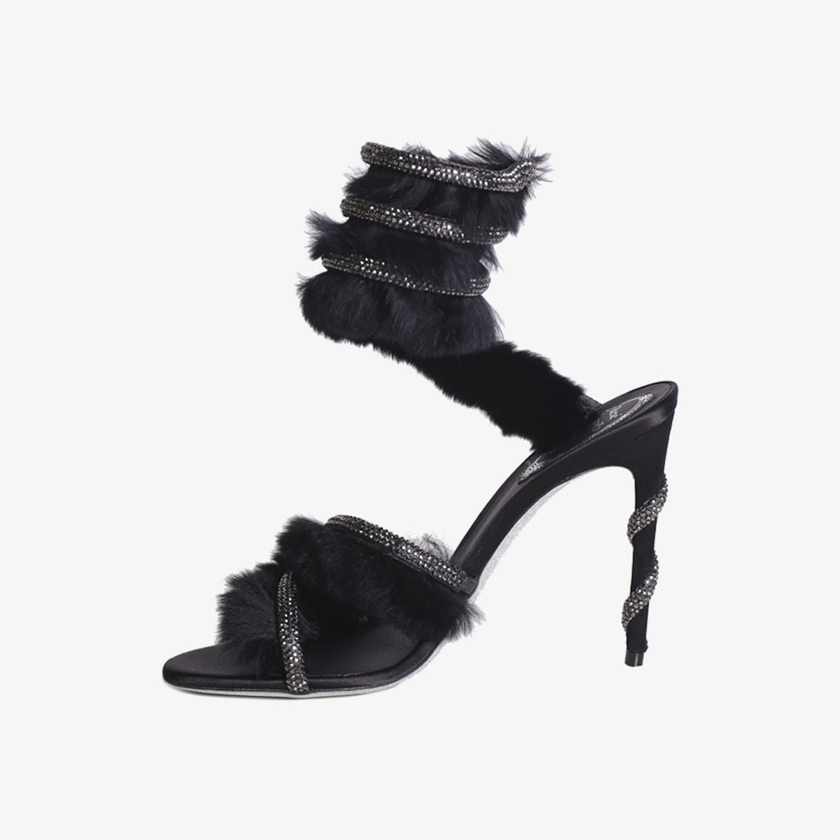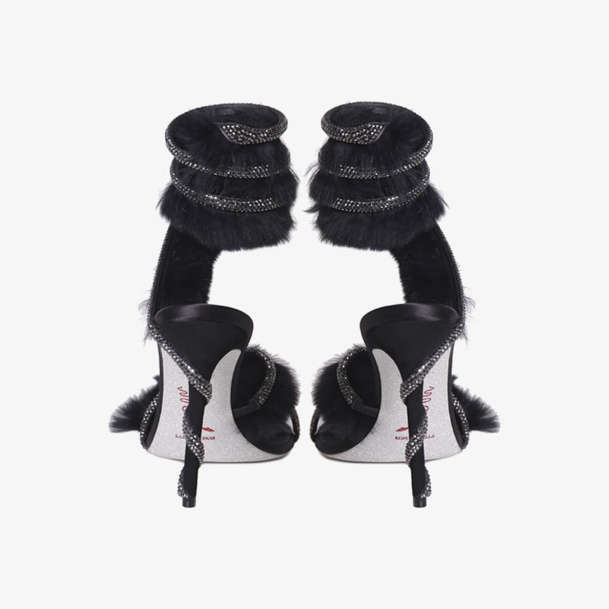 Đôi giày trong hình là một thiết kế cao gót đầy sang trọng của René Caovilla. Với màu đen tinh tế, đôi giày này có điểm nhấn là các dây đai phủ lông mềm mại, tạo cảm giác êm ái và quý phái. Trên mỗi dây đai còn được trang trí bởi những viên đá lấp lánh, tạo nên hiệu ứng lấp lánh quyến rũ, làm tăng thêm vẻ đẹp nổi bật cho người mang. Gót giày cao, thon gọn, giúp tôn dáng và phù hợp cho những dịp sang trọng như tiệc tối hay sự kiện quan trọng.