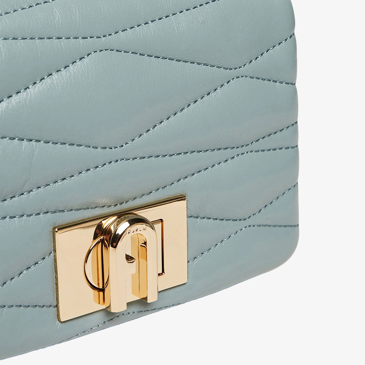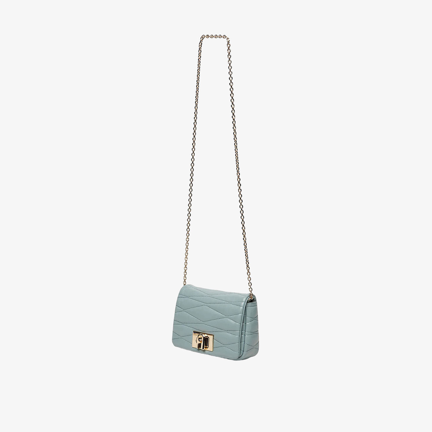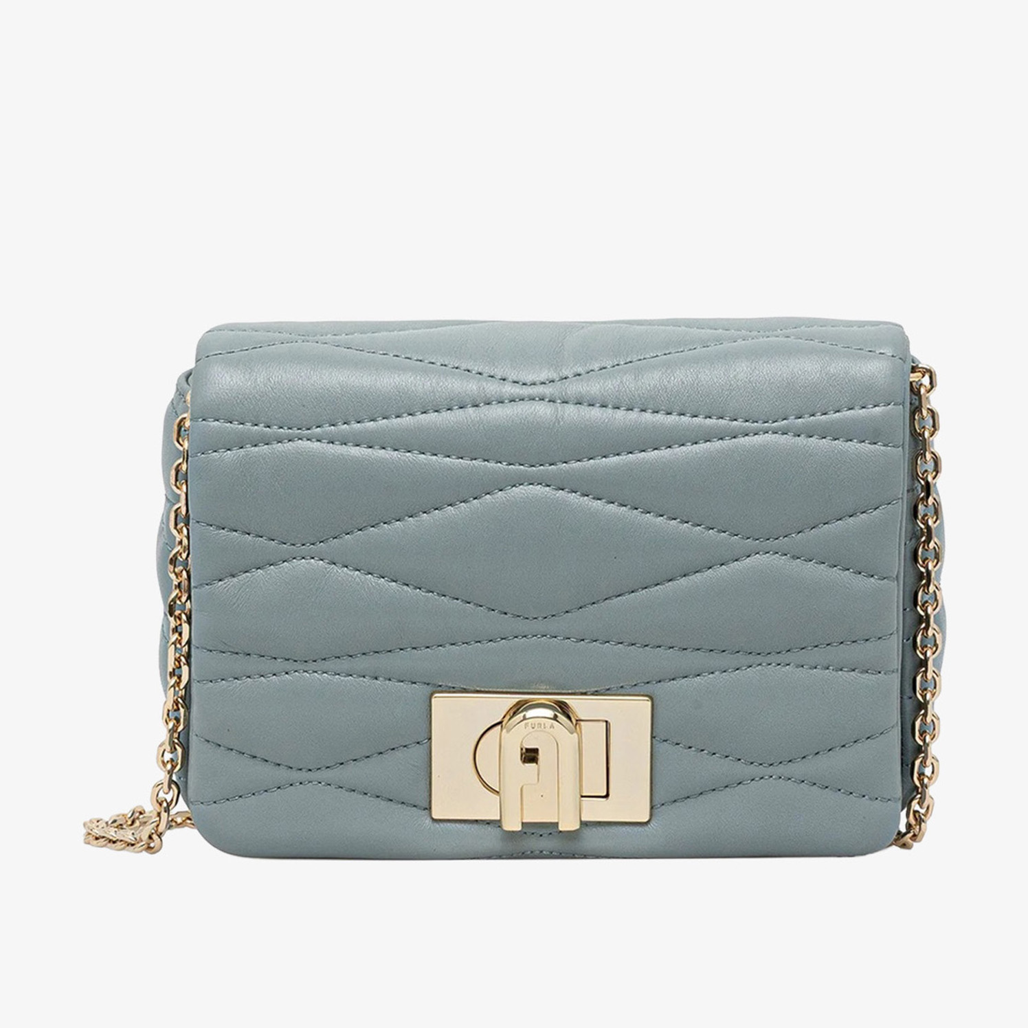 Furla Mini Bag mang gam xanh nhạt thanh lịch, nổi bật với họa tiết chần bông (quilted) tinh tế, tạo hiệu ứng bề mặt sang trọng và mềm mại. Thiết kế nắp gập cổ điển kết hợp cùng chi tiết kim loại ánh vàng, mang đến tổng thể vừa nữ tính vừa thời thượng.