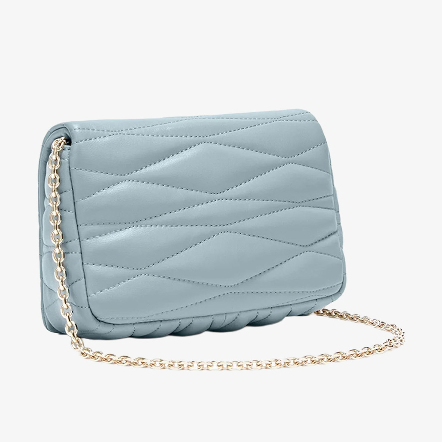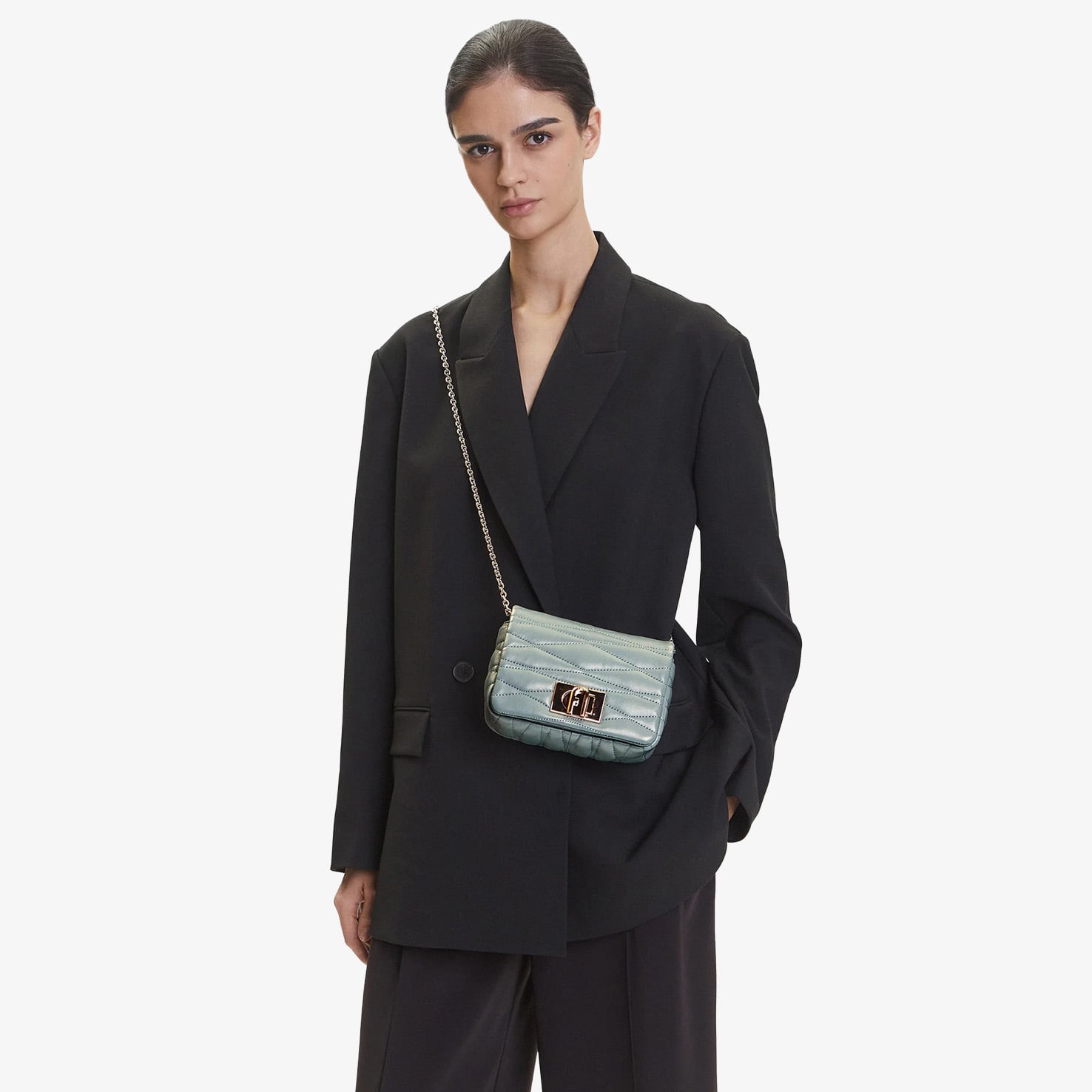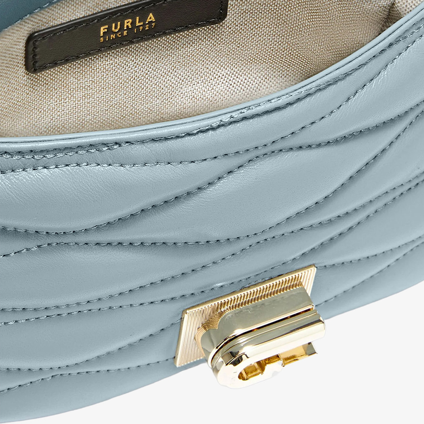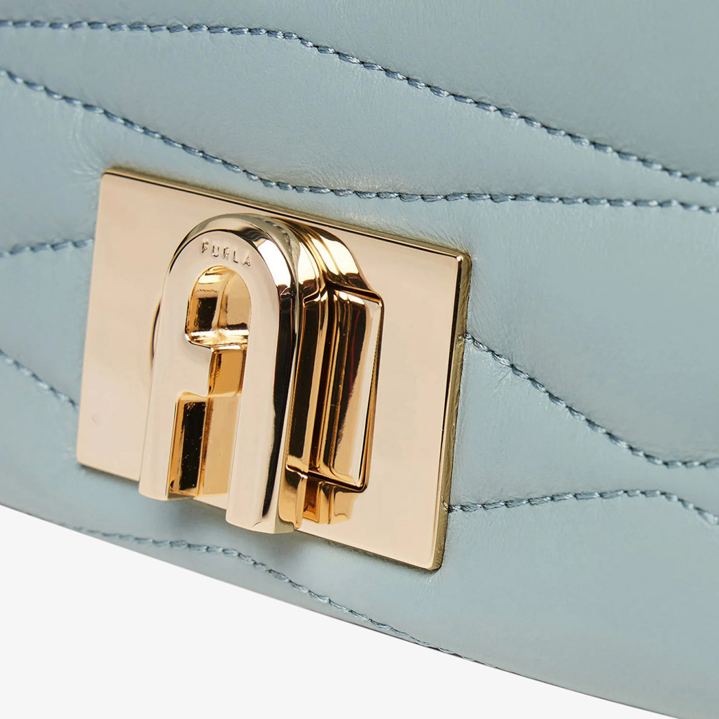 Furla Mini Bag mang gam xanh nhạt thanh lịch, nổi bật với họa tiết chần bông (quilted) tinh tế, tạo hiệu ứng bề mặt sang trọng và mềm mại. Thiết kế nắp gập cổ điển kết hợp cùng chi tiết kim loại ánh vàng, mang đến tổng thể vừa nữ tính vừa thời thượng.