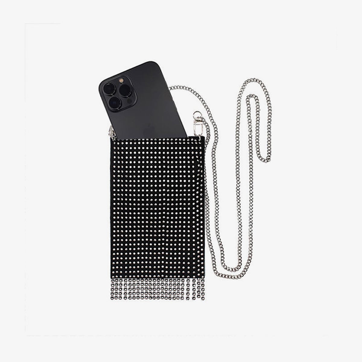 Điểm đặc biệt của chiếc túi đựng điện thoại này là được tạo thành từ những dải đá lấp lánh màu bạc trên nền đen, tạo hiệu ứng tua rua siêu hợp thời trang! Nàng hãy diện nó trong những buổi tiệc khiêu vũ để mang đến nét quyến rũ và tinh tế cho vẻ ngoài của mình!