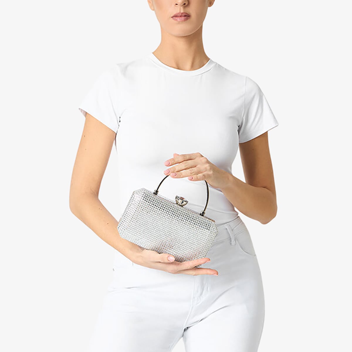 Sẵn sàng thu hút mọi ánh nhìn và thêm một chút sang trọng cho bộ trang phục của nàng chưa? Chiếc clutch màu bạc ánh kim đính đá mới này chính là phụ kiện hoàn hảo cho những buổi tối mùa hè lộng lẫy nhất. Với lớp ngoài lấp lánh đầy nổi bật, chiếc túi mang đến một sự tương phản hiện đại và tinh tế - đặc biệt khi kết hợp cùng một bộ trang phục allblack.