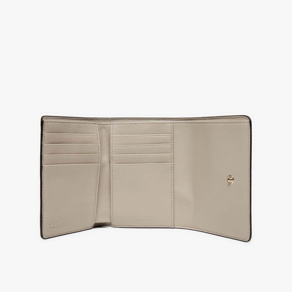 Chiếc ví Furla Sfera được làm từ chất liệu da mềm mại. Hoàn hảo về tính năng, ví có thiết kế gập đôi và bên trong được sắp xếp một cách logic để giữ cho tiền mặt, thẻ tín dụng và giấy tờ tùy thân một cách ngăn nắp. Nắp ví cùng với khóa bấm được trang trí bằng phụ kiện kim loại hình cầu mạ vàng – biểu tượng mang tính biểu trưng của thương hiệu Furla.