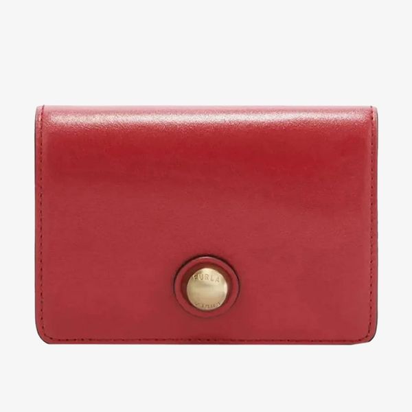 Nắp ví đóng mở bằng nút bấm, nổi bật với chi tiết kim loại hình cầu mạ bóng – biểu tượng đặc trưng của thương hiệu Furla.